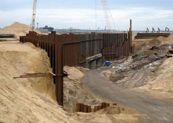 Шпунтом можно «обшить» новую дамбу или усилить старую. Прочные стенки позволяют использовать насыпь в любом качестве, в том числе для сооружения железных и автодорог.